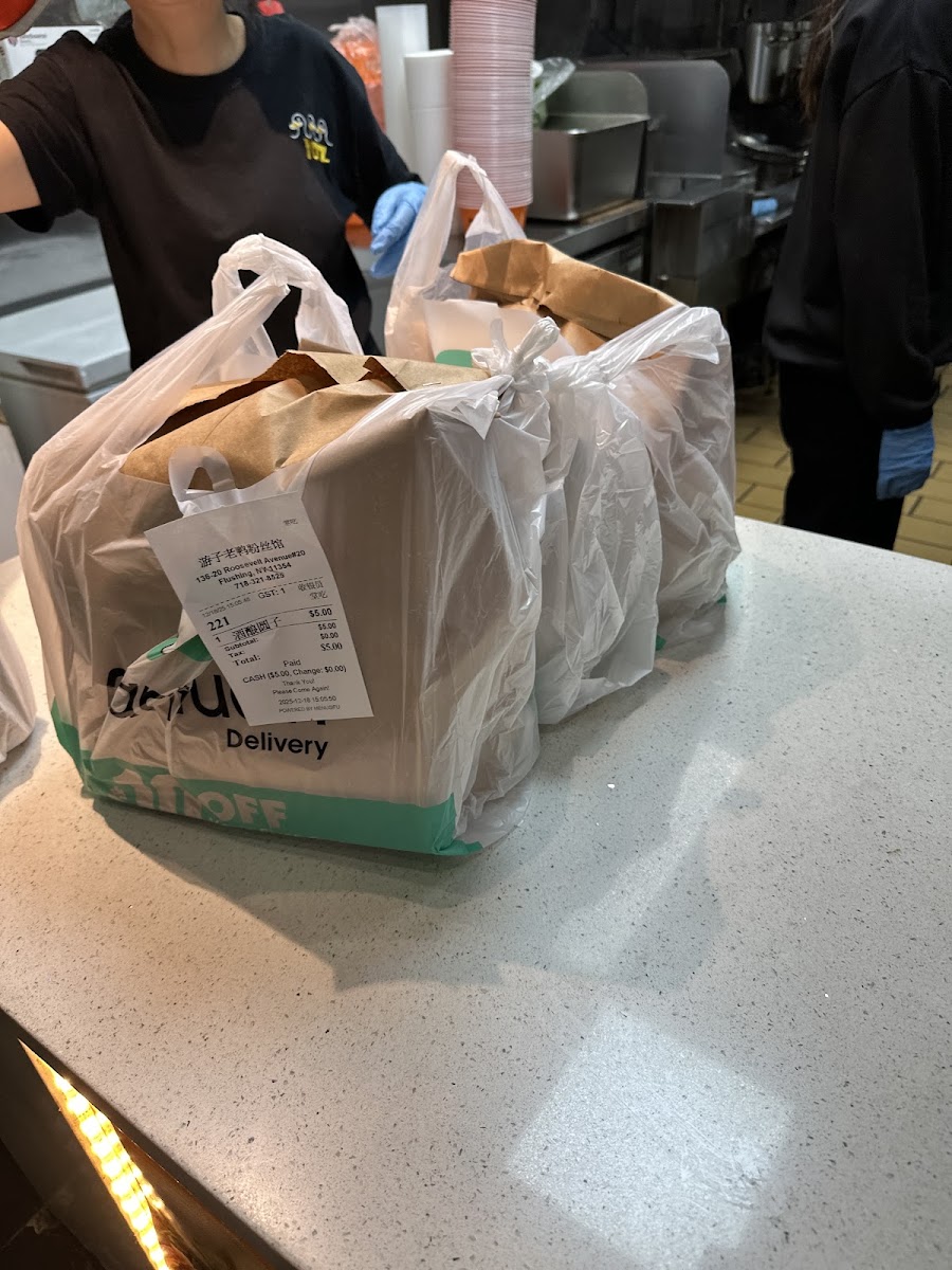 They were quick with my order. Got the duck offal vermicelli noodle soup. The duck blood tasted a bit weird compared to the Brooklyn location. Tasted like it was spoiled. Had a medicine taste to it. Packaging was nice though for take out. The noodles and offals were on the top container while the soup was separated on the bottom. Also, comes with cilantro and chili sauce. No tax, $10.